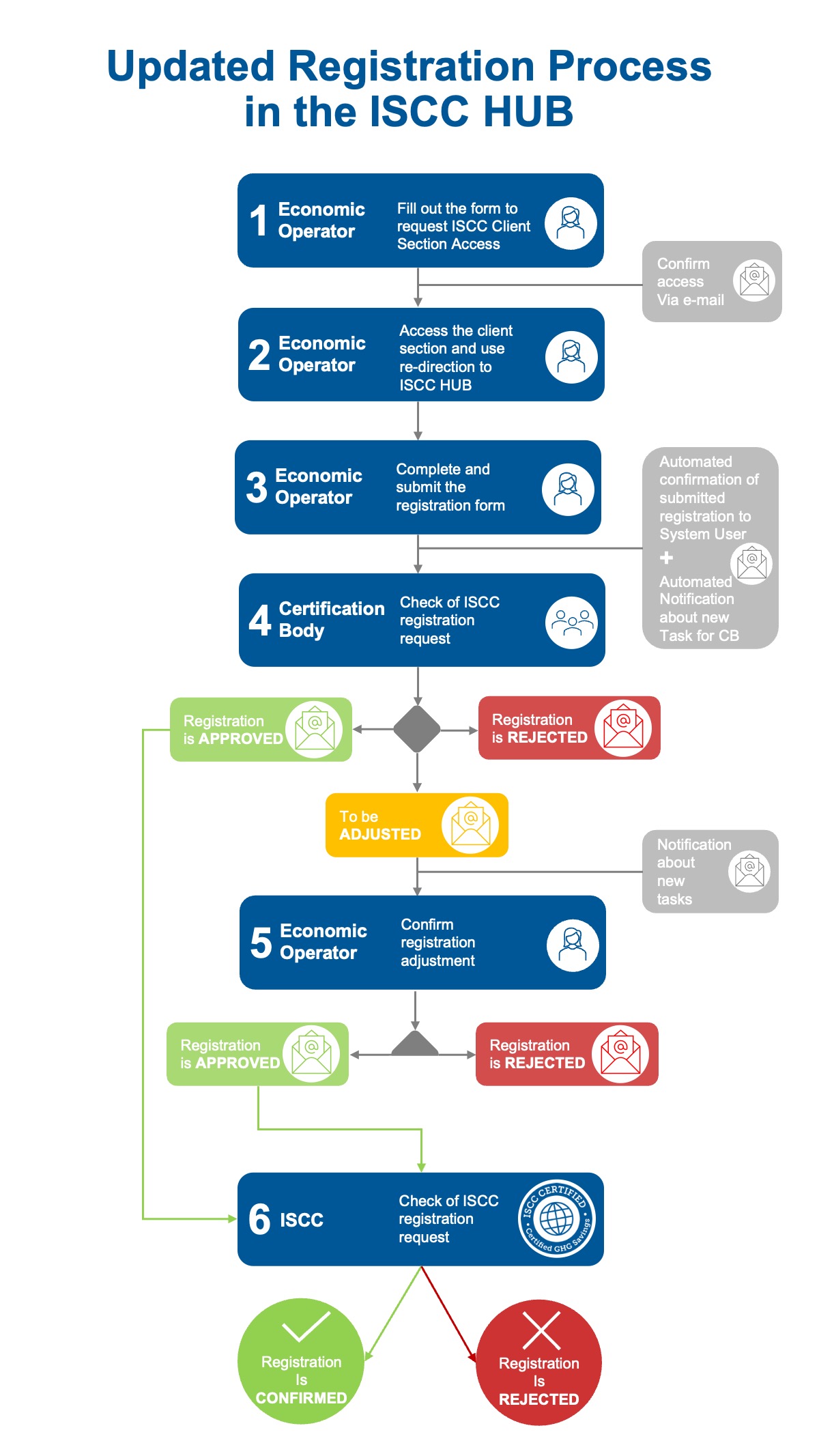 - Your selected Certification Body and ISCC check each submitted registration and may contact the applicant in case further information is required. The process might take a few days until the registration can be confirmed and the registration number is provided.