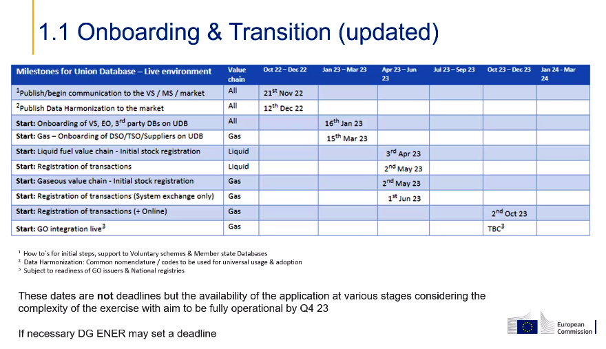 In order to complete the preparation of the UDB, all Economic Operators will have to be onboarded by the end of 2023. However, the launch of the application to register injection and consumption of energy units from the supply chain of gaseous fuels will only start after the technical links between UDB and respective national registries of Guarantees of Origin (GOs) will be established.