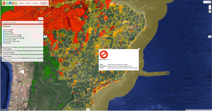 GRAS is a tool providing comprehensive sustainability-related geo-referenced information on biodiversity, land use change, carbon stock and social indices. GRAS provides a compilation of different layers from national and international databases on biodiversity. The information is immediately available and presented in a very user-friendly way. Below, Brazil is shown as example. The maps differentiate clearly between no go and risk areas. This helps to conduct the risk assessments, and saves time and costs in audits.