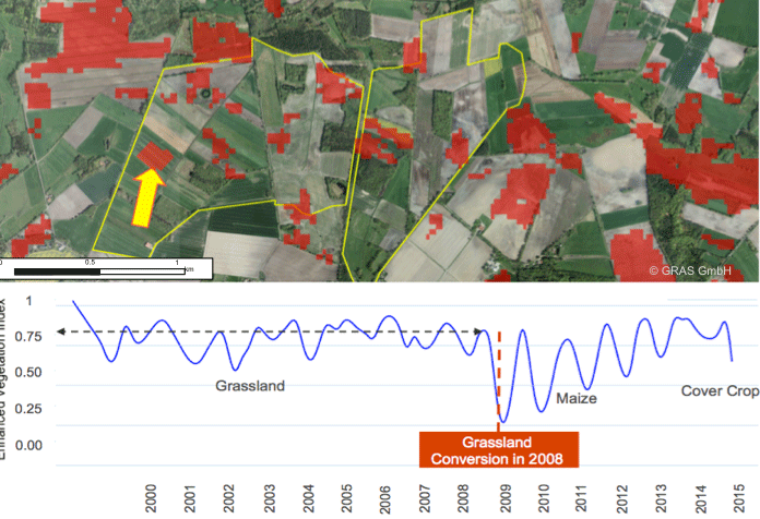 (EVI). Using EVI time series from 2000 until today, GRAS users can differentiate among the types of green cover, see the history of the land use, and most importantly detect the exact point in time of LUC. It enables the user to identify deforestation, replanting activities, grassland conversion and cropping activities (see examples in Fig 2. and 3). Combining ISCC with GRAS facilitates to conduct audits and increases at the same time the credibility of sustainability certification.