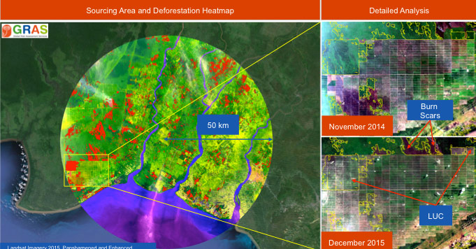 GRAS also provides carbon maps and important information regarding social issues on a country (and partly regional) level. A key functionality is the detection of land use change. Auditors and companies use GRAS to verify the occurrence of land use change by using a simple to interpret, yet powerful, greenness index called Enhanced Vegetation Index