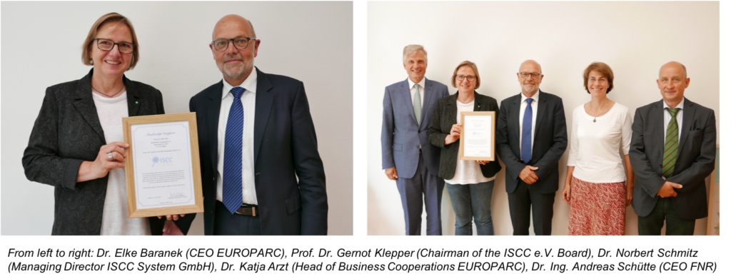 Dr. Elke Baranek, CEO of EUROPARC, received the membership certificate from Prof. Dr. Gernot Klepper, Chairman of the ISCC e.V. Board and Dr. Norbert Schmitz, Managing Director of the ISCC System GmbH. At the ceremony, Gernot Klepper pointed out that “balancing the need for providing humanity with nature’s services while maintaining sustainability in our natural ecosystems are goals that both EUROPARC and ISCC share.”