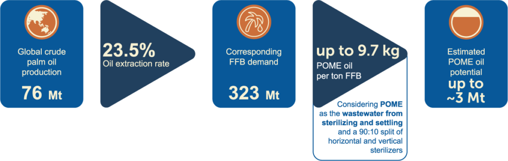 Another approach can be based on research literature[2], [9] which reports that typically 5-7.5 metric tonnes (Mt) of wastewater are generated per Mt of crude palm oil, and 0.7 g of fat is contained in 100 g of POME (see table 1 in reference [2]). Given the global production of 76 Mt of CPO, which generates 380-570 Mt of POME with a fat content of 7 g/kg, a global POME oil potential of up to 4 Mt can be estimated.