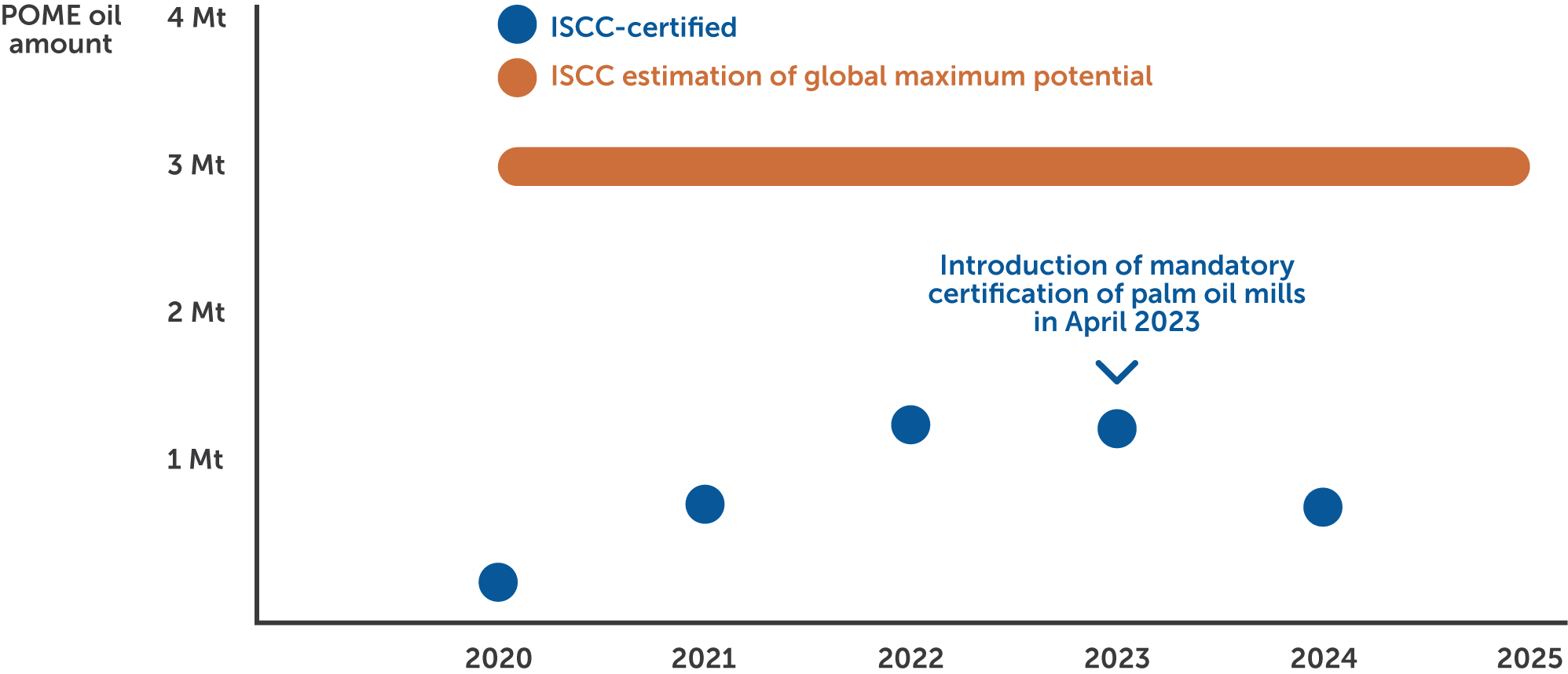 The introduction of mandatory individual certification for palm oil mills supplying waste and residue materials has made it more difficult, especially for smaller mills, to participate in the certification system due to the effort and costs involved. As a result, some mills may have opted out, which, most likely, combined with an increased stringency in certification, has contributed to a decline in ISCC EU-certified volumes of POME oil (see Figure 3).