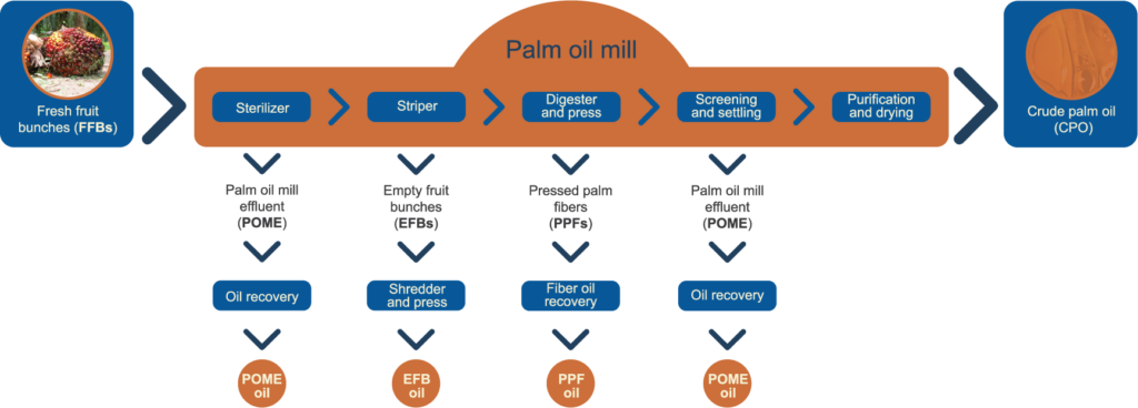 At a palm oil mill, harvested palm fresh fruit bunches (FFBs) are processed to obtain crude palm oil (CPO), which can be further refined into high-purity palm oil for food or other applications. The palm milling process (see Figure 1) involves several steps, such as sterilising palm fresh fruit bunches, stripping, digestion, and a combination of screening and settling. These steps generate various types of waste and residues, such as empty fruit bunches (after removing the oil-containing fruits), pressed palm fibres (after digestion and pressing of the fruits), and wastewater (POME).