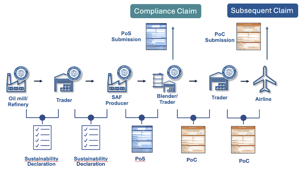 Generally, fuel suppliers provide a Proof of Sustainability (‘PoS’) document to authorities for a given batch of fuel to validate compliance with sustainability and GHG emissions savings criteria. However, PoS documents are not allowed to be ‘re-issued’ to, or ‘re-used’ by, further downstream entities in a supply chain after they have been previously submitted against claims. This can present a challenge, especially in aviation and maritime markets, where some regulations may allow for subsequent claims to be made by downstream users (e.g., airlines).