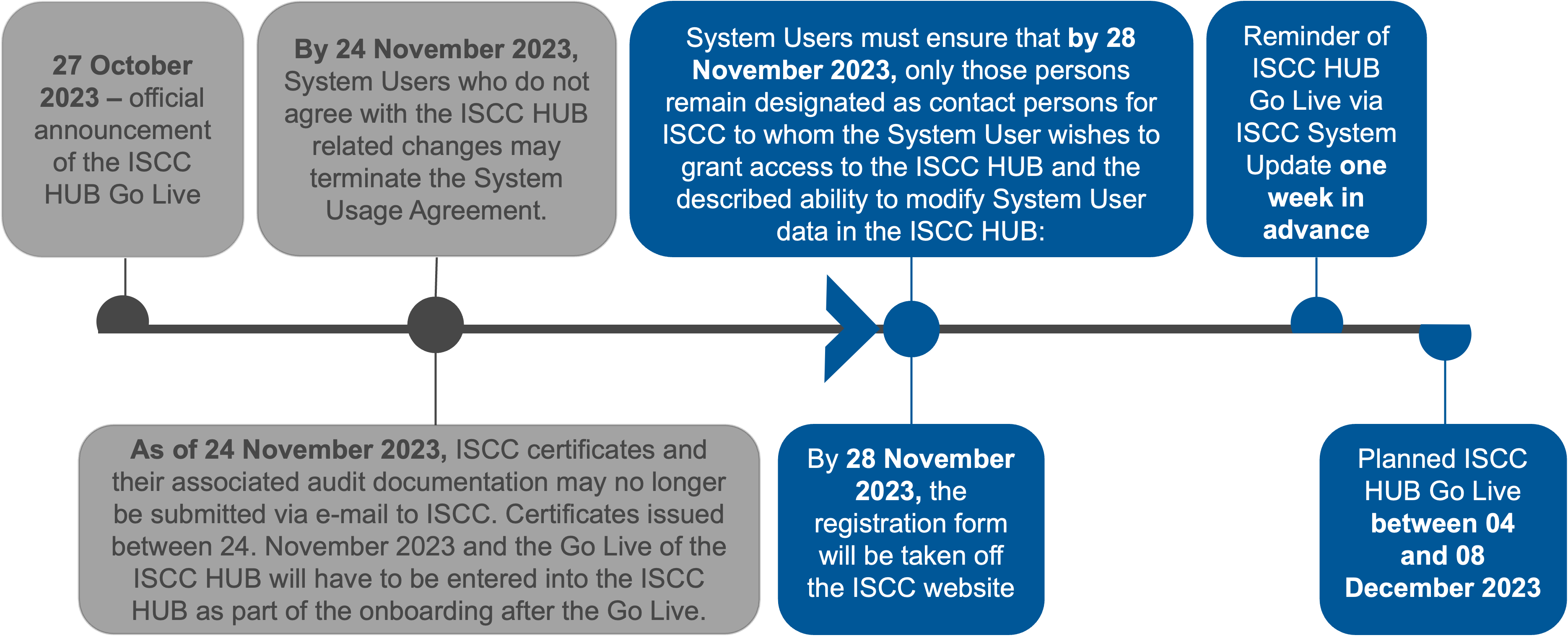 As we have already announced in our previous System Update: The ISCC HUB will go live between 4-8 December 2023, marking a significant milestone in our commitment to enhancing user experience and streamlining processes. This online platform will improve the management of registration and certification-related data for both, System Users and Certification Bodies (CBs).