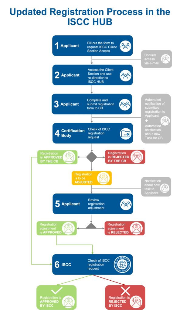To allow for the System User data migration into the ISCC HUB, the current registration form will be taken off the ISCC website on 28 November 2023. CBs and Applicants are advised to ensure that necessary registrations and registration adjustments will be made before 28 November 2023. Registrations will only be possible again in the ISCC HUB after the official Go Live.