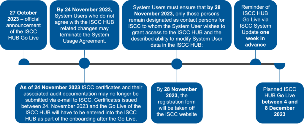 As briefly mentioned in previous ISCC communications, it is with great pleasure that we announce the planned Go Live of the ISCC HUB in early December. This is part of our continuous endeavour to increase user-friendliness and improve and speed-up processes. The Go Live is planned for calendar week 49, 4-8 December 2023.